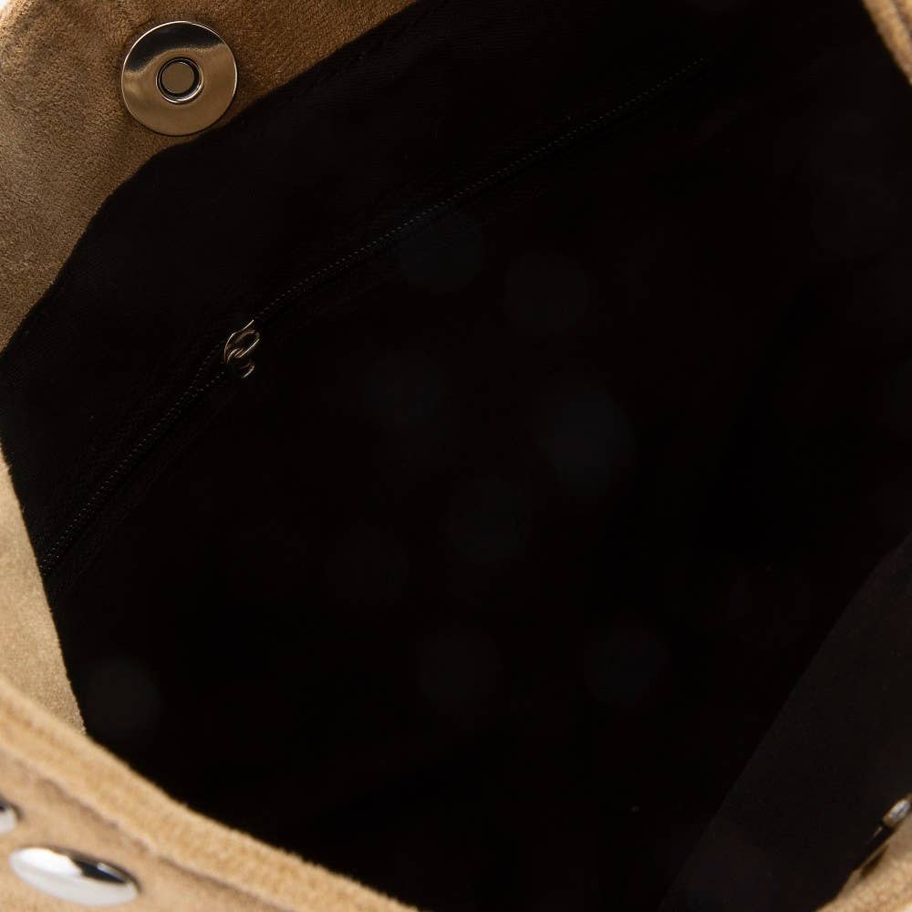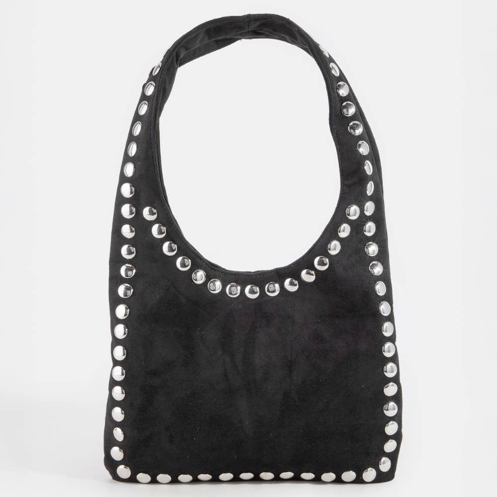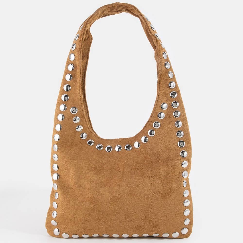 This shoulder bag brings a stunning grommet border studded suede style. Delight in the nuanced details that make this shoulder bag a testament to fine design and impeccable taste.