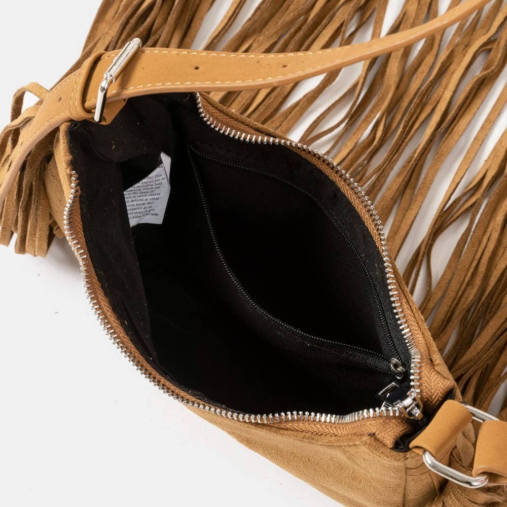 This crossbody bag showcases a unique suede fringe style. Experience refined sophistication with this understated yet stylish piece.