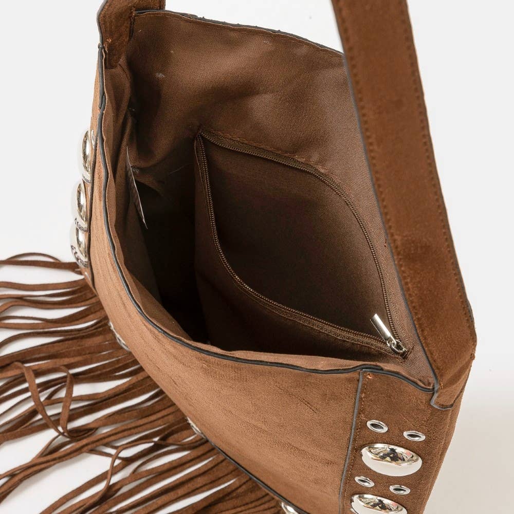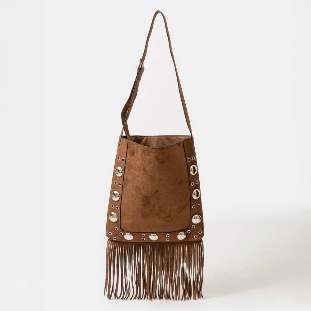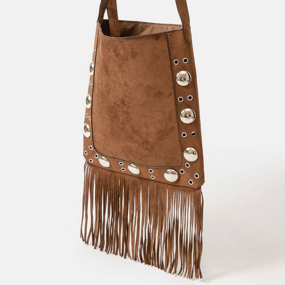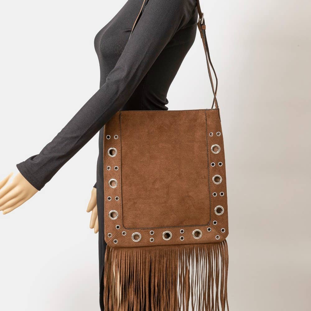 This tote bag brings a stunning faux suede grommet accent fringe style. Embark on a journey of sartorial refinement as this tote bag effortlessly complements your fashion sense.