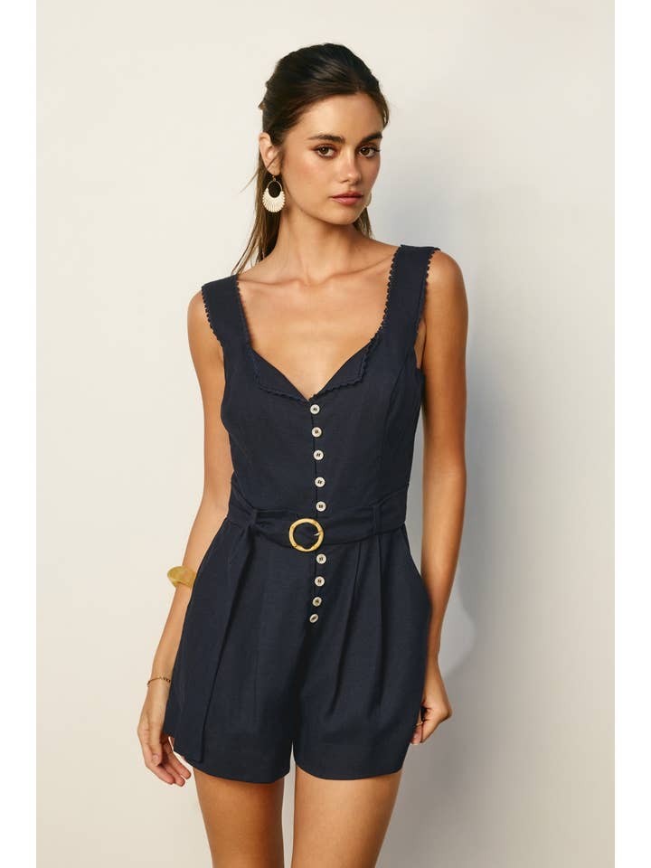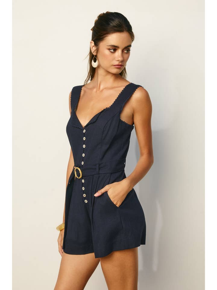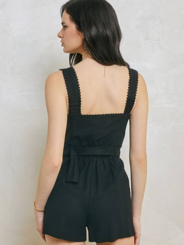 Effortless elegance meets everyday comfort in this charming lace trim romper. The delicate foldover neckline frames your face beautifully, while intricate lace detailing adds a touch of romance. Button down the front for easy styling, and cinch the waist with the included sash belt featuring a natural bamboo O ring for a polished finish. Elastic bands at the back waist and shoulders provide a flattering, secure fit that moves with you. Practical side slant pockets keep your essentials close, while the soft lining ensures all-day comfort. Perfect for casual outings or dressed up for a night.