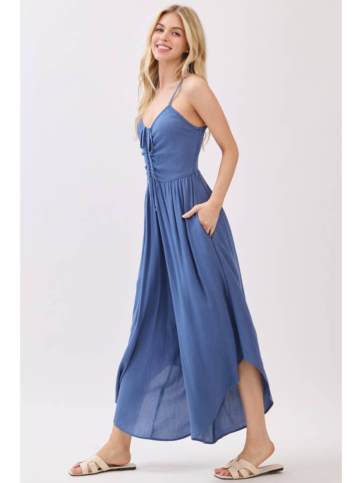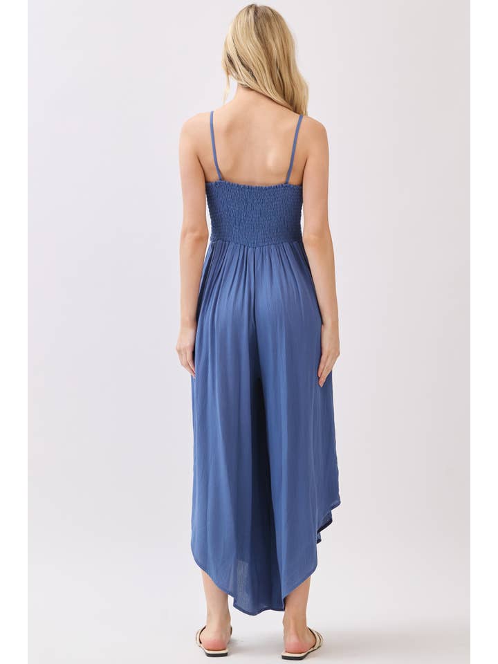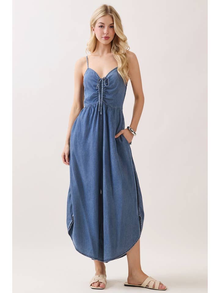 This midi jumpsuit is your ticket to looking effortlessly put-together! Crafted from quality woven fabric in a solid hue, it features flattering front ruching that cinches just right. The rounded hem adds a modern touch that works with sneakers or heels. Simple, stylish, and ready for whatever your day brings.