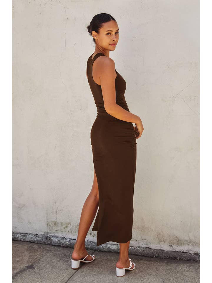 Slip into effortless elegance with this racerback midi that's got serious style credentials. The ruched side detail cinches your silhouette in all the right ways, while a cheeky side slit keeps things flirty and fun. Perfect for those days when you want to look put-together without trying too hard—whether you're heading to brunch or a night out with friends.