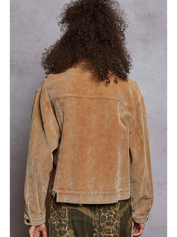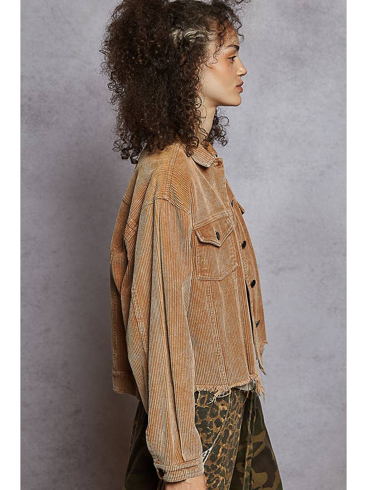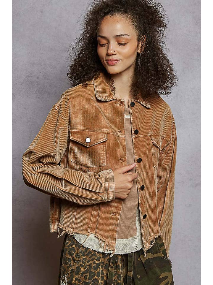 Effortlessly cool and easy to style, this piece is designed in a corduroy trucker jacket silhouette with a relaxed fit that layers beautifully over any outfit. It features a classic button closure, dual chest pockets, and sleeves with adjustable cuffs for a customizable feel. An asymmetrical raw hemline that adds just the right amount of edge.