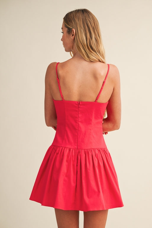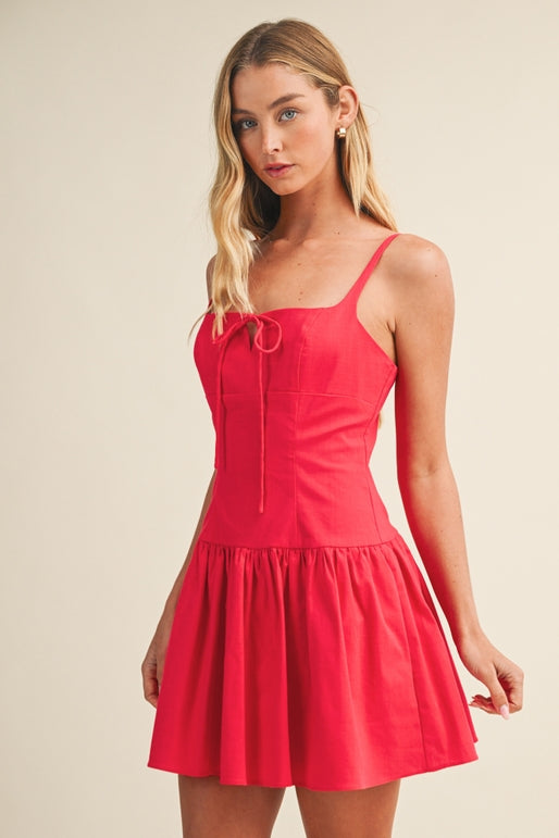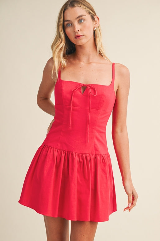 Front Tie Strap Drop Waist Skort Dress Effortlessly chic meets playfully practical in this drop waist skort dress. The adjustable front tie straps let you customize your fit while creating a flattering silhouette, while the built-in skort keeps you comfortable and ready for anything. Perfect for those days when you want the ease of a dress with the freedom of shorts. Dress it up with heels or keep it casual with sneakers—this versatile piece transitions seamlessly from brunch to adventure.