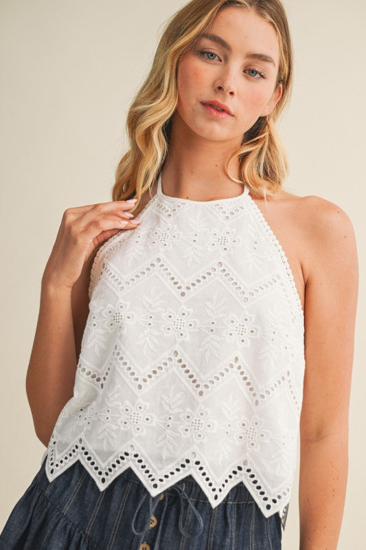 Flirty and feminine, this woven eyelet halter top is your go-to for warm-weather style. The delicate cutout details add a touch of romance, while the halter neckline offers flattering support and a chic silhouette. Perfect for casual outings, beach days, or dressing up with your favorite bottoms. Breathable fabric keeps you cool and comfortable all day long.