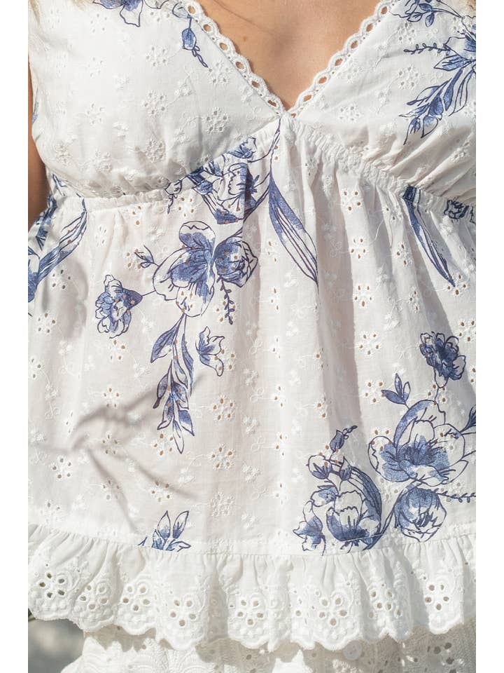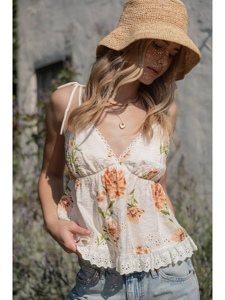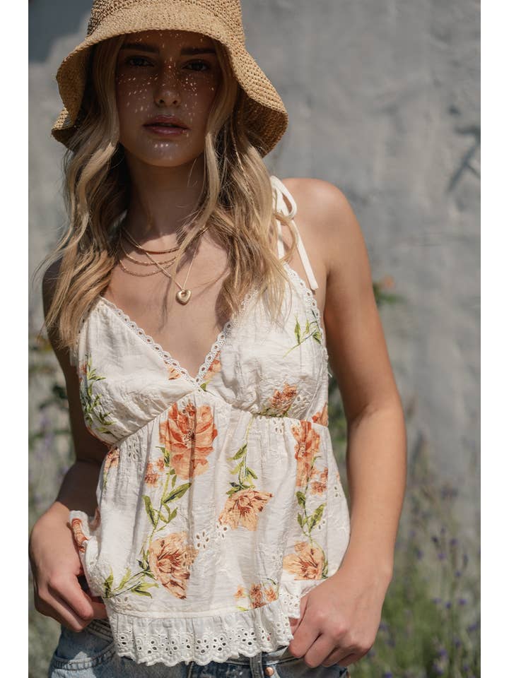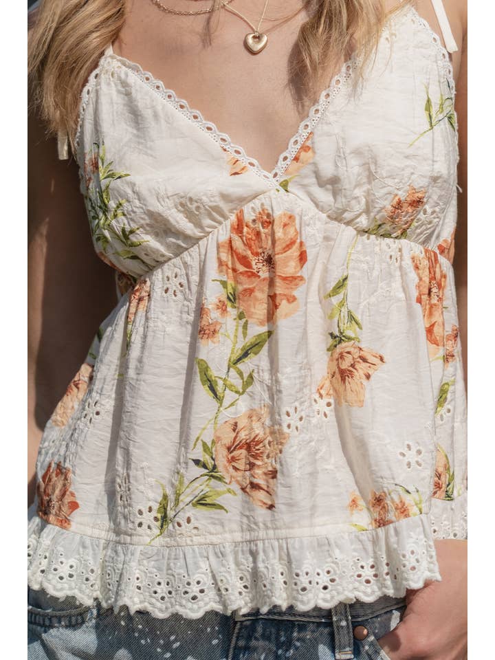 Sunshine and style collide in this charming floral eyelet top! Delicate lace trim frames the neckline while adjustable tie shoulders let you customize the fit for maximum comfort. The deep V-neck adds a flirty touch that's perfect for warm weather adventures, whether you're heading to brunch, the beach, or a casual day out. Breathable fabric keeps you cool when temperatures rise, making this a go-to piece for your sunny-day rotation.