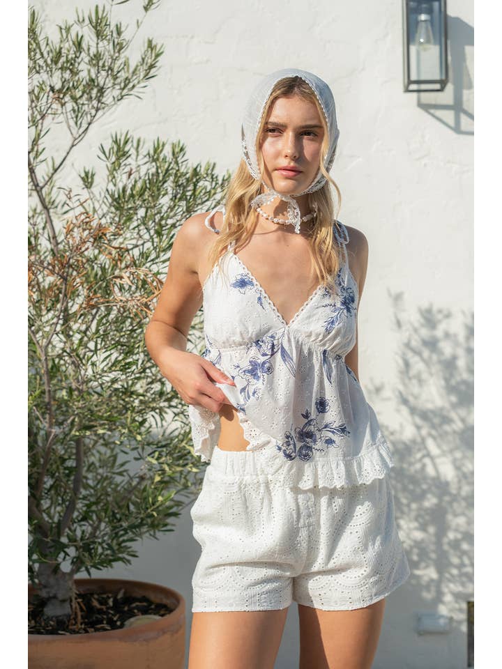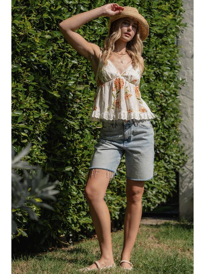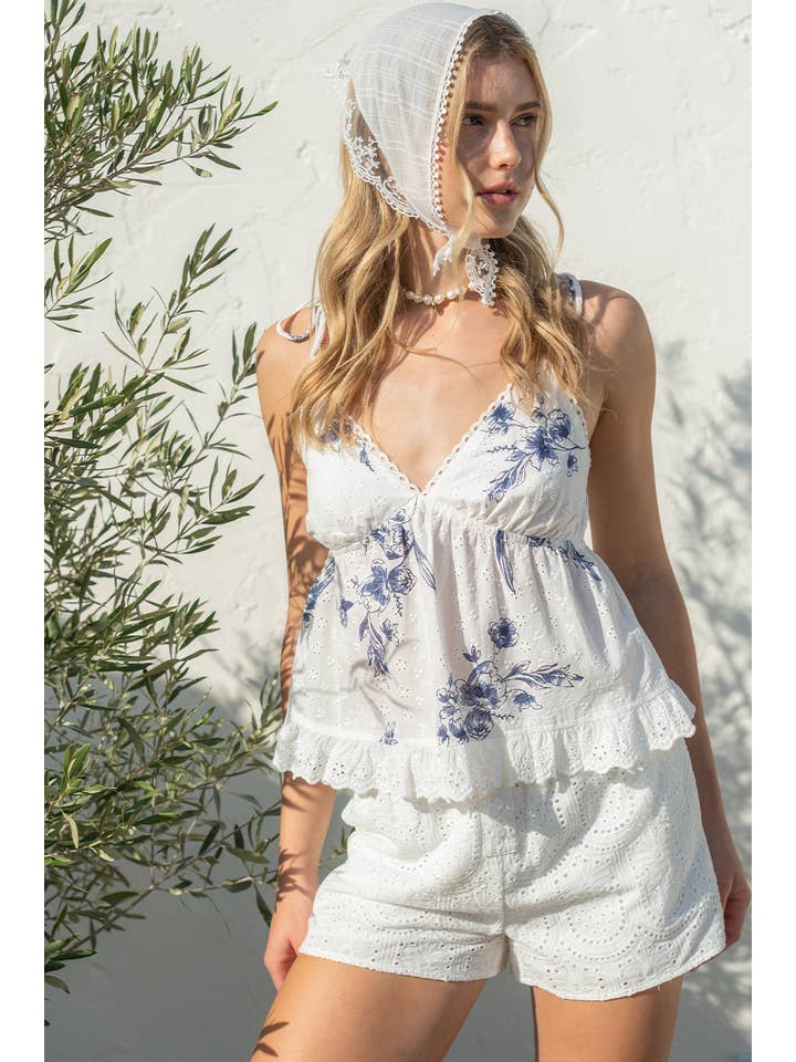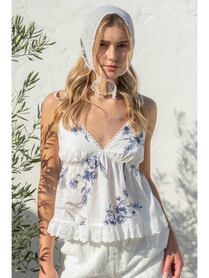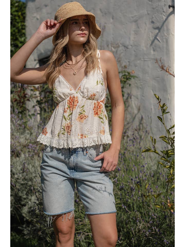 Sunshine and style collide in this charming floral eyelet top! Delicate lace trim frames the neckline while adjustable tie shoulders let you customize the fit for maximum comfort. The deep V-neck adds a flirty touch that's perfect for warm weather adventures, whether you're heading to brunch, the beach, or a casual day out. Breathable fabric keeps you cool when temperatures rise, making this a go-to piece for your sunny-day rotation.