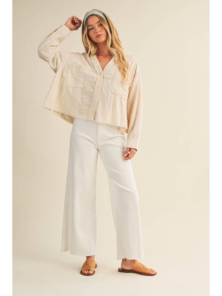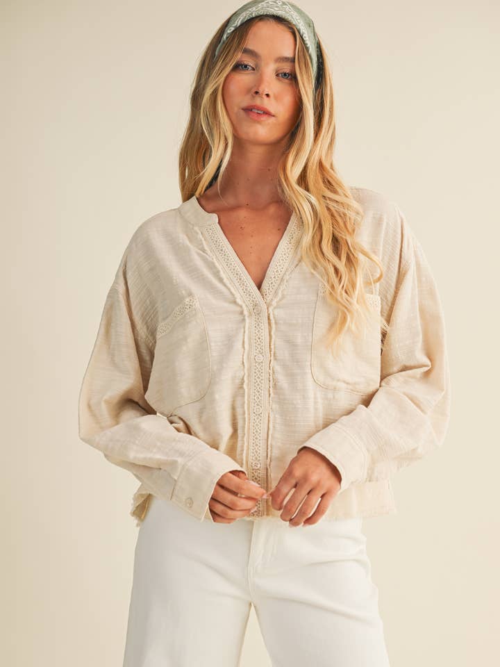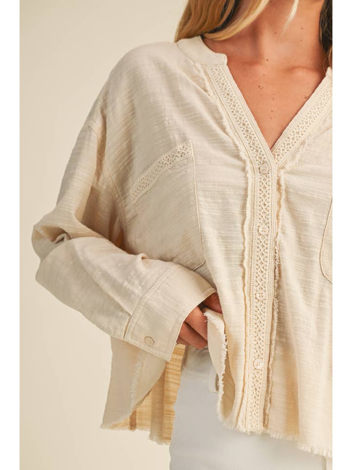 Effortlessly chic meets delightfully edgy with this lace-trimmed top. Soft lace detailing frames the neckline while raw-cut edges add an intentionally undone vibe that feels fresh and modern. Perfect for layering or wearing solo, this piece transitions seamlessly from casual coffee dates to evening plans.