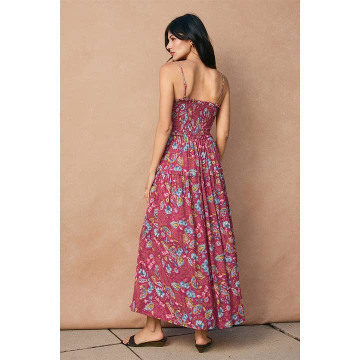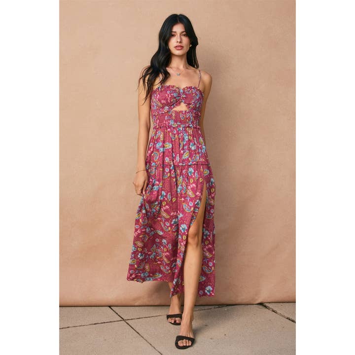 Twirl into elegance with this stunning Paisley Maxi Dress, where vintage charm meets modern edge. The ruched sweetheart neckline and smocked bodice create a flattering silhouette, while raw-edged ruffles add playful texture throughout. A daring cutout below the chest and front side slit keep things flirty and fun. Adjustable spaghetti straps with ring and slider detail let you customize the fit, and partial bodice lining ensures comfort.