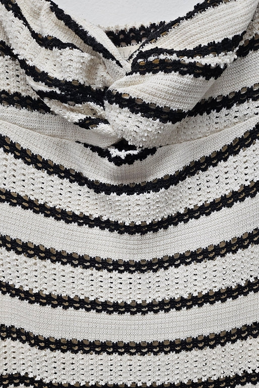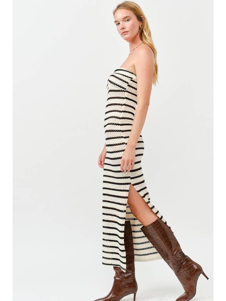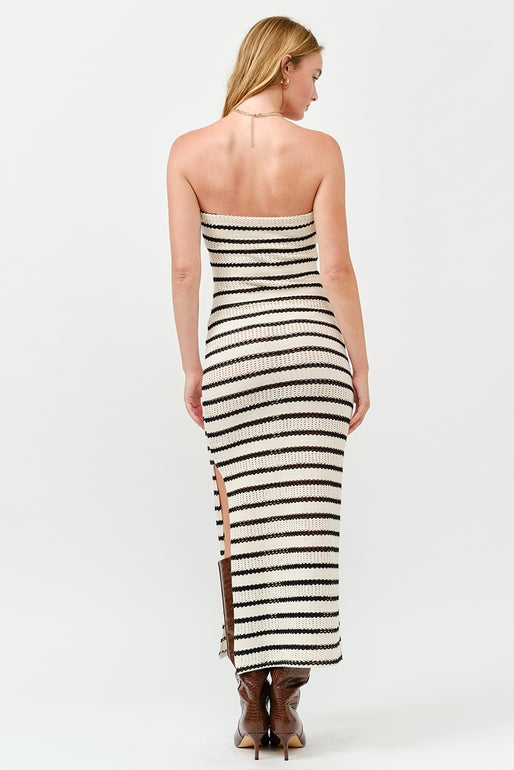 Meet your new go-to dress—striped knit magic that works harder than you'd think. This fitted maxi features a chic bandeau top with an unexpected twist detail right at the chest, because who says simple has to be boring? The side slit keeps things breezy, while the unlined knit fabric moves with you all day long. Stripes, sophistication, and just the right amount of sass.