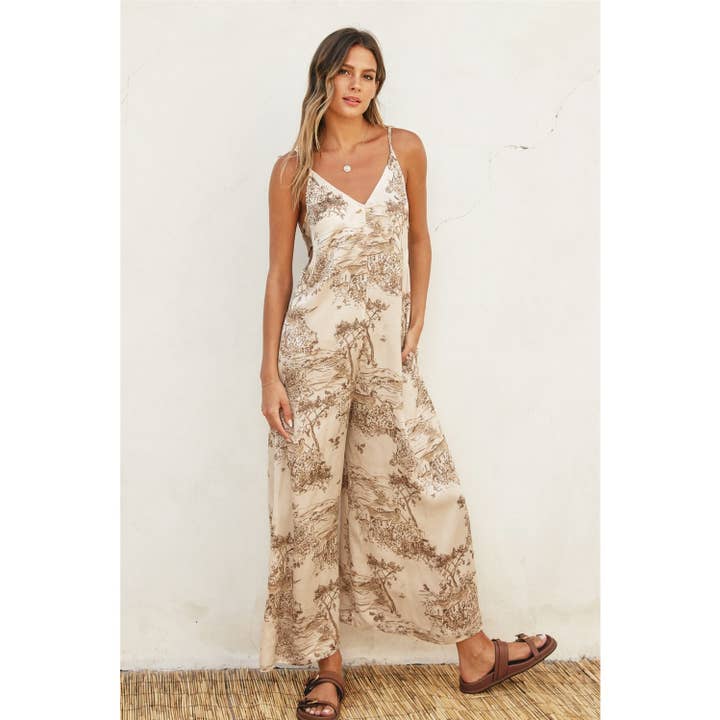 Meet your new go-to jumpsuit—no buttons, no zippers, just pure pull-on convenience. This playful one-piece features a chic V-neck and a show-stopping open back with a tie closure that's equal parts flirty and functional. The sleeveless cut and unlined fabric keep things light and airy, while generous wide legs and a relaxed silhouette let you move freely.
