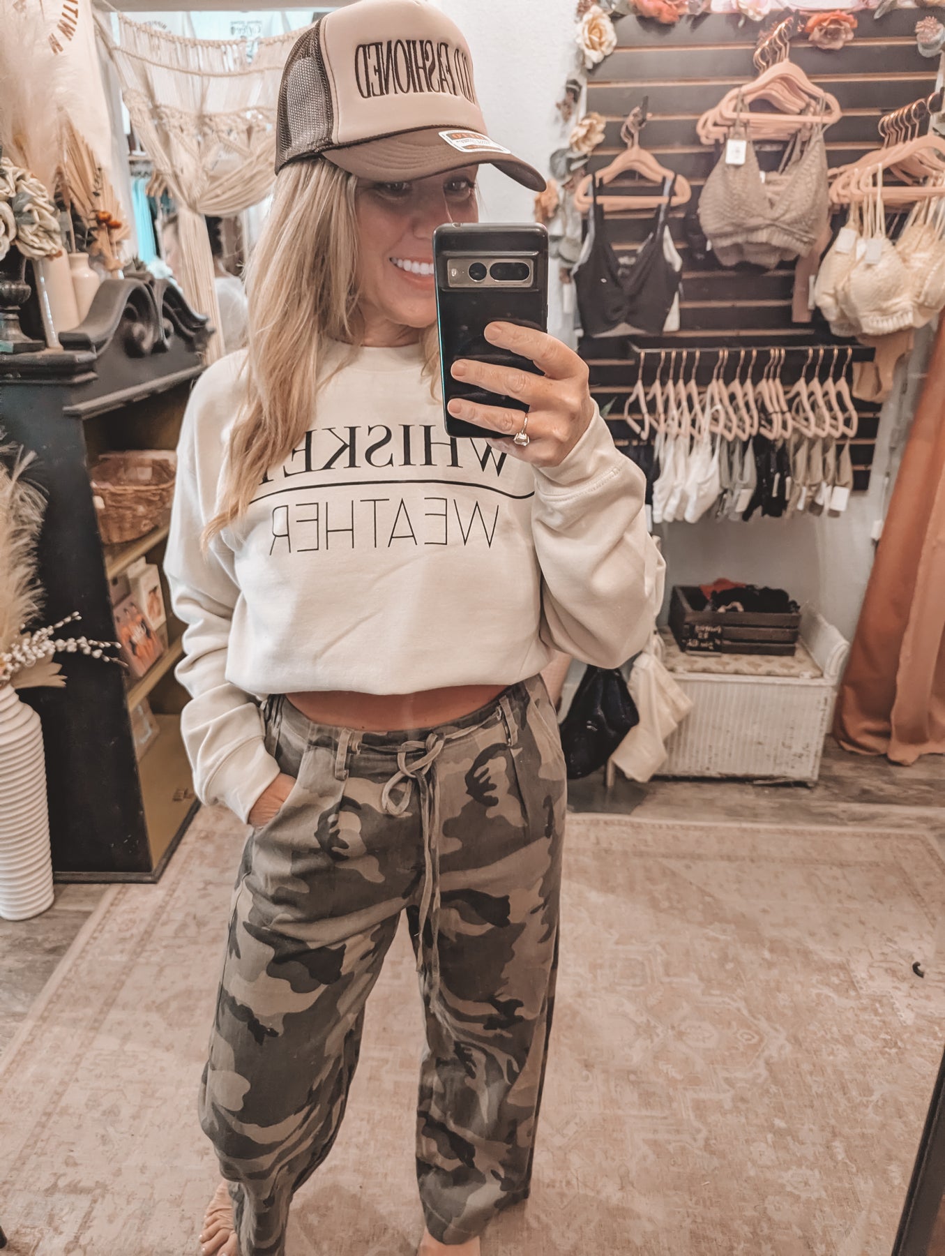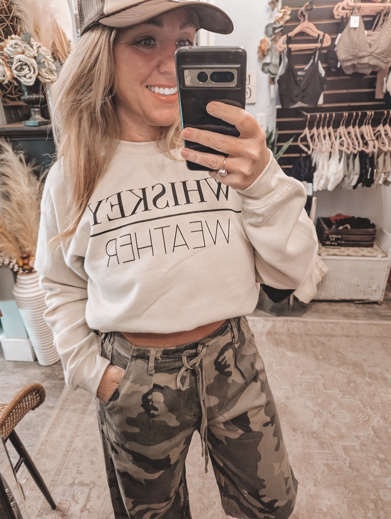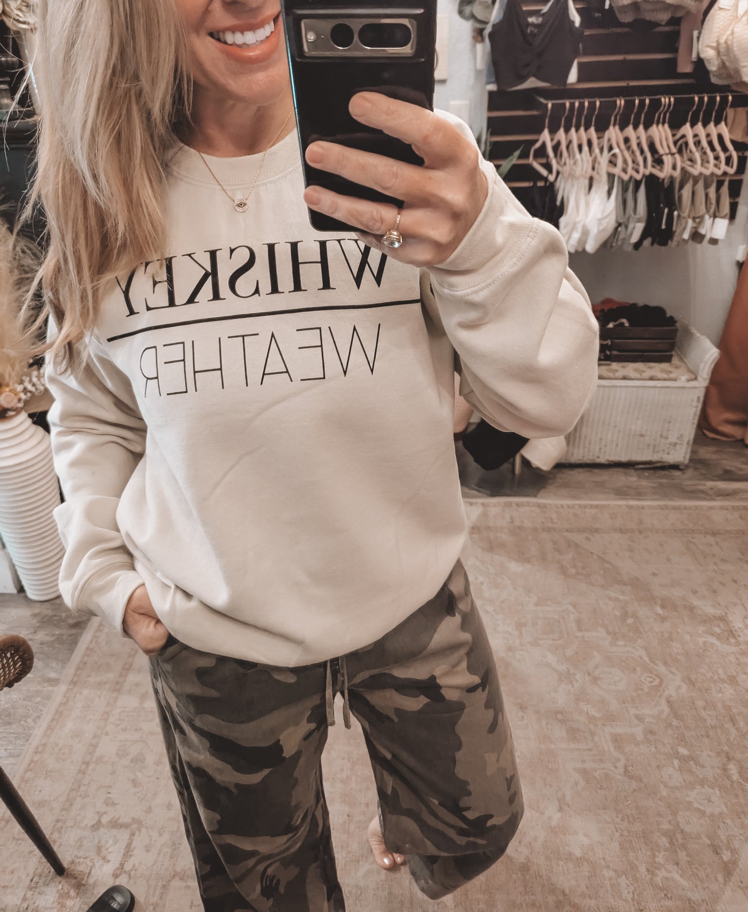 Pour a glass and get cozy. This “Whiskey Weather” sweatshirt is made for crisp fall nights, tailgates, and fireside lounging. Neutral tones and bold lettering make it a versatile piece that pairs perfectly with jeans.