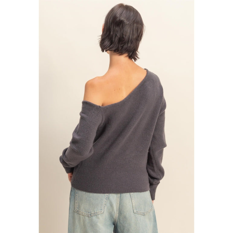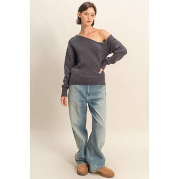 This off-shoulder knit sweater features a relaxed fit with a unique one-sided neckline that exposes only one shoulder. The opposite side offers a dropped shoulder for added comfort and style. Finished with a fitted ribbed hem, it pairs effortlessly with jeans or skirts. Ideal for chic fall layering and casual outings.