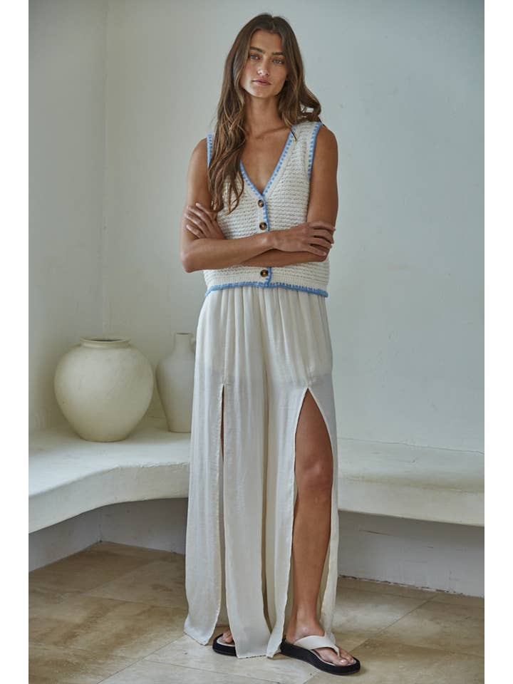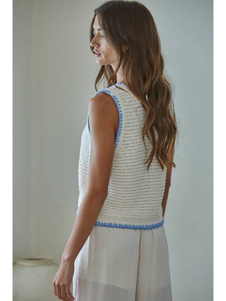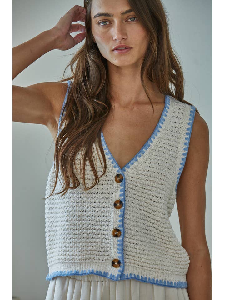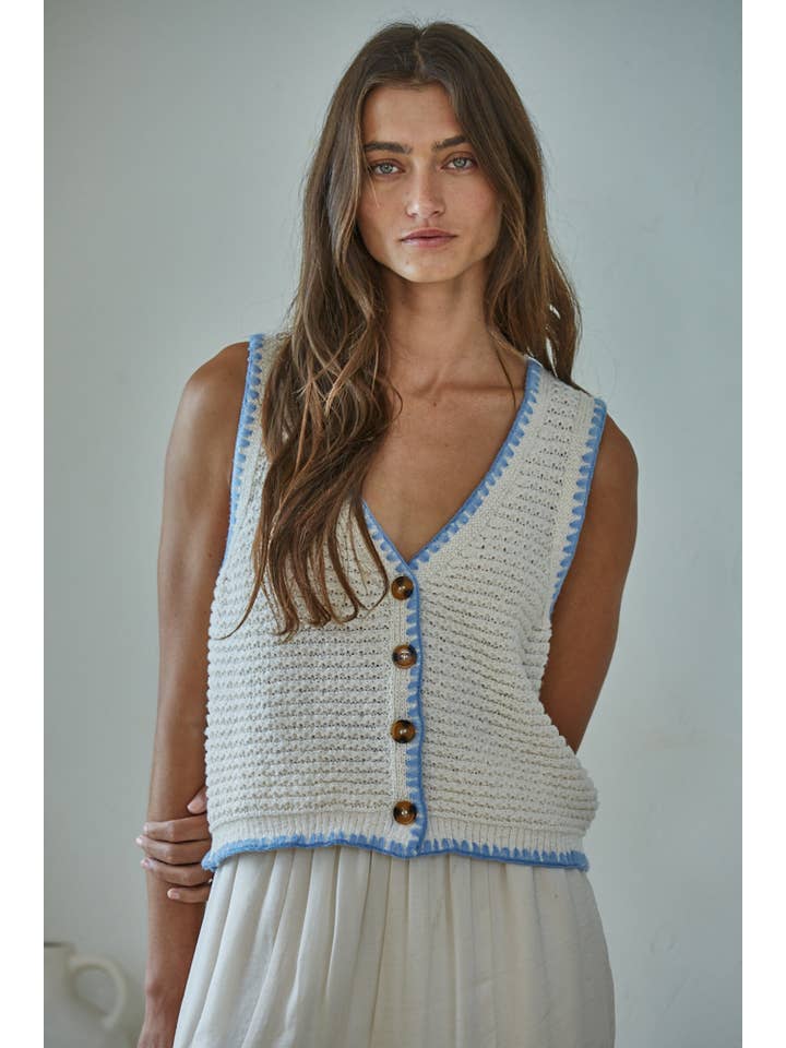 Layered sophistication meets cozy comfort with this versatile sweater vest. Crafted from a breathable polyester-cotton-acrylic blend, it features a flattering V-neck and sleek button-down front for effortless styling. The sleeveless design makes it perfect for layering over tees, long-sleeve tops, or wearing solo when the weather cooperates. Whether you're dressing up for brunch or keeping it casual, this wardrobe essential transitions seamlessly from season to season.