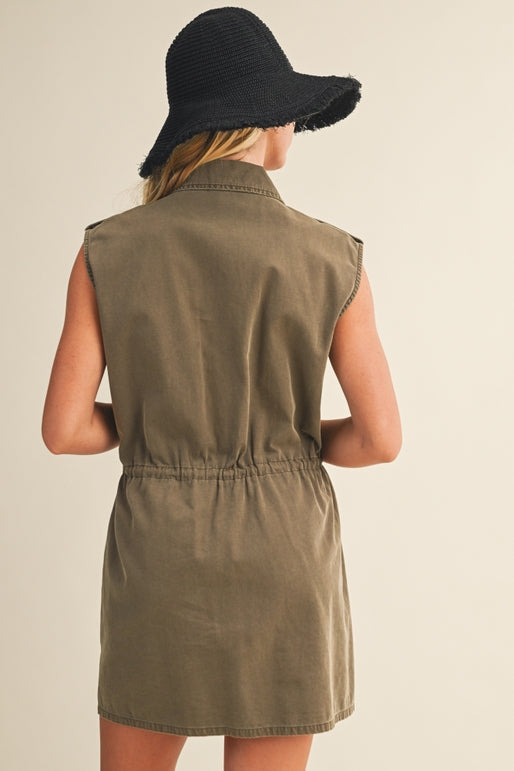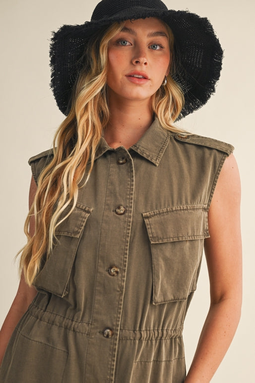 Meet your new go-to dress—a breezy button-down sleeveless number that's equal parts chic and practical. Those handy flap pockets? They're ready for your essentials, so you can ditch the bag if you're feeling it. The crisp, clean lines give off timeless vibes, while the sleeveless cut keeps you cool and comfortable.