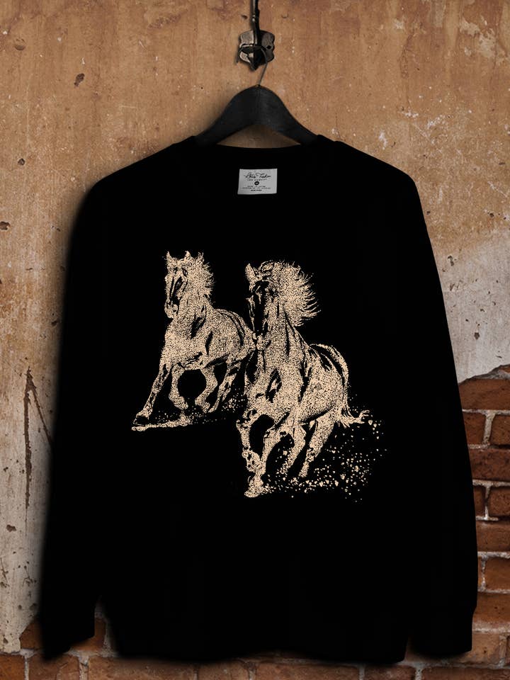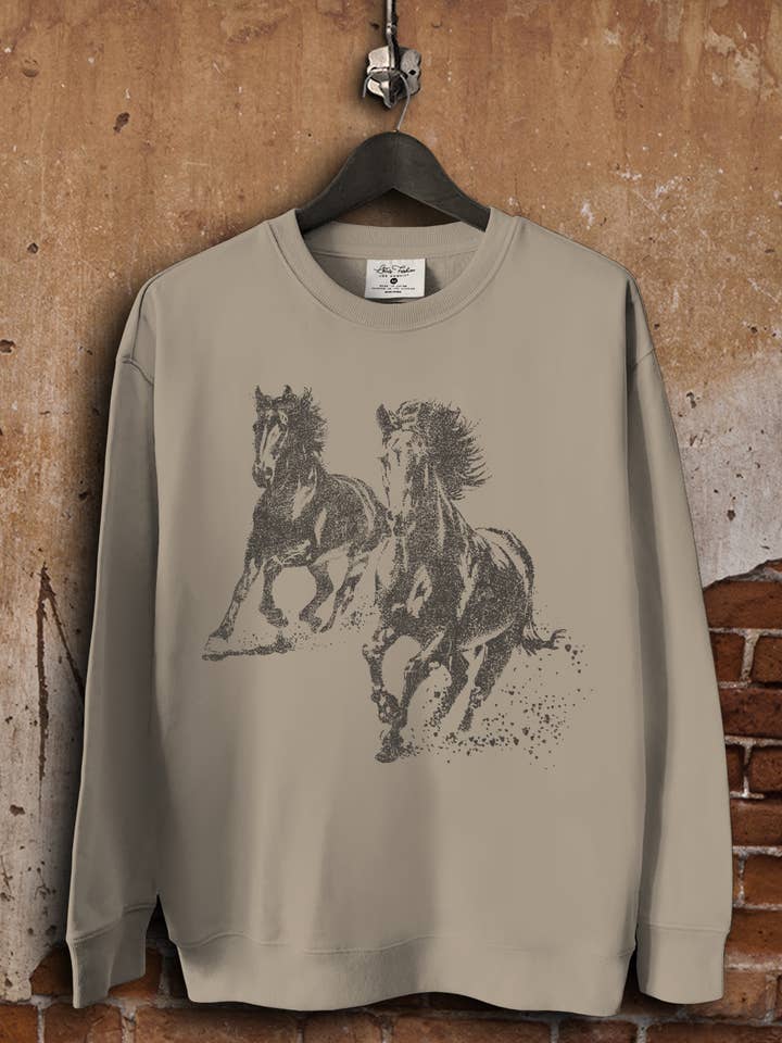 Saddle up for comfort in our Running Horses Sweatshirt! This laid-back crew neck pullover features a bold silk-screened graphic that'll have heads turning. Crafted from a dreamy French Terry cotton-poly blend, it's got that perfect slouchy fit that feels like a cozy hug. Soft, breathable, and effortlessly cool—the kind of sweatshirt you'll reach for again and again, whether you're hitting the trails or just vibing at home.